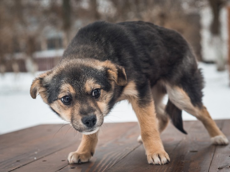 This puppy is showing signs of fear with its tail tucked, lowered head, closed mouth and staring eyes.